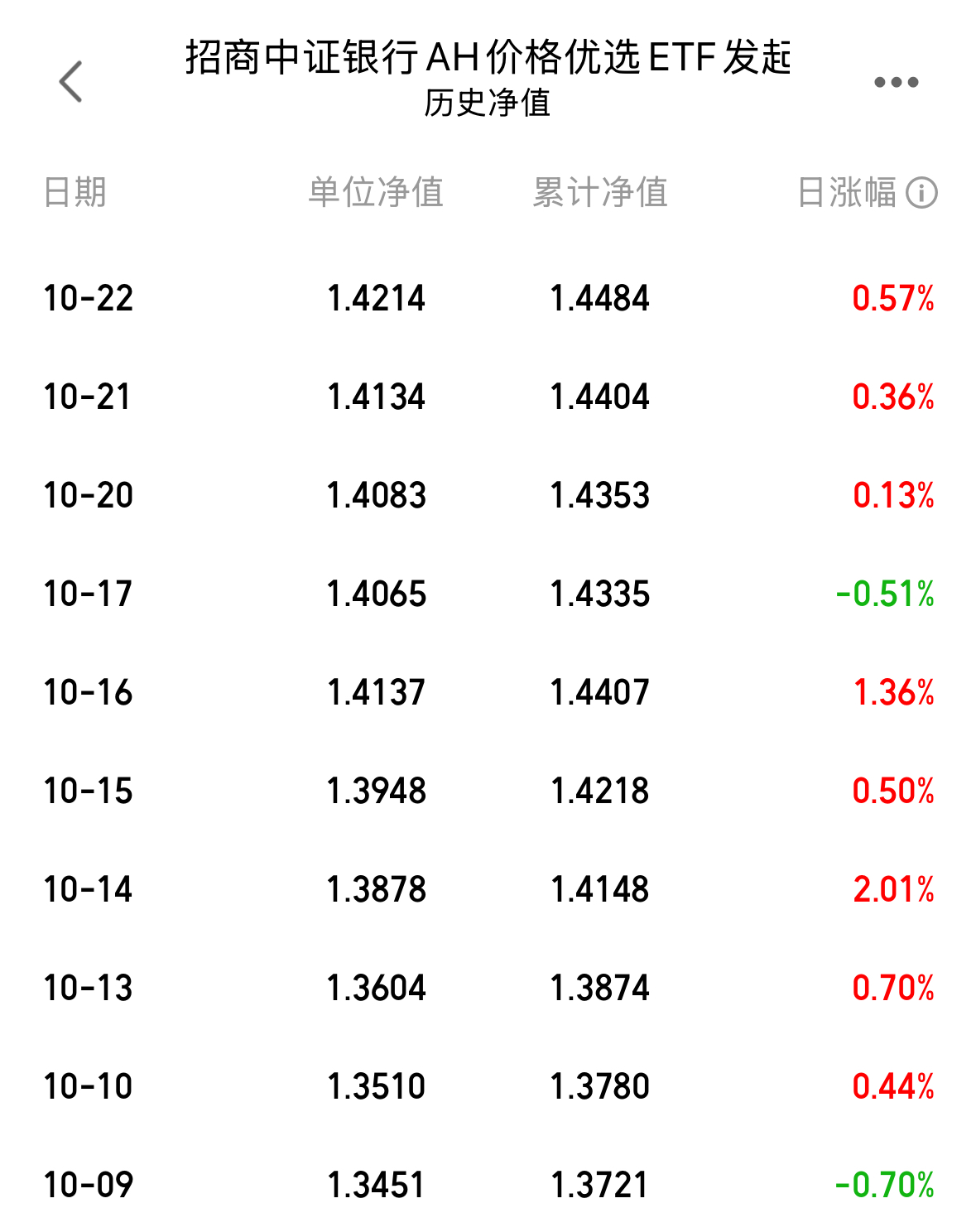 与科技相反,以银行为代表的防御资产倒是表现出了较好的韧性!如果说把10月看作是对前期急涨后的震荡期,那么现阶段就很有必要配置些防御资产,我近期也知行合一增配了不少红利,今天再加一份$招商中证银行AH价格优选ETF发起式联接C(OTCFUND|016573)$。