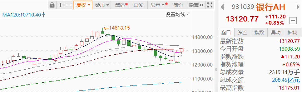 技术上,中证银行AH指数已展开周线级别反弹,周K前期在确认60周线支撑有效后便上攻重返5周线支撑上方,沿着5周线向上运行,一旦拿下20周线支撑将打开继续向上修复的空间。就现阶段看,市场观望避险情绪较浓,银行板块启动上攻概率大,是时候布局起来了。