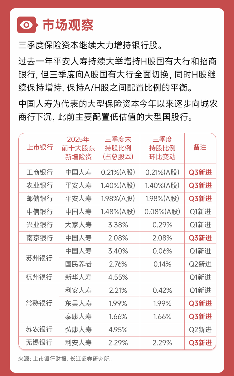 险资三季度继续增持,银行估值与股息中长期吸引力上升!