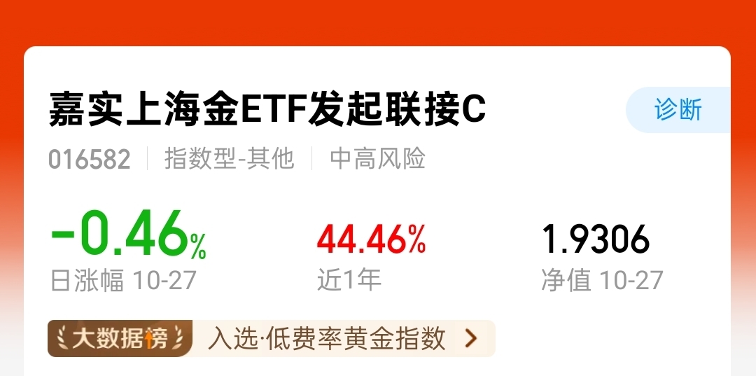 经过这段时间的震荡回调,黄金市场开始渐渐趋于稳定了,今天继续逢低加仓1000$嘉实上海金ETF发起联接C$ ,这个产品在这次黄金市场大地震中下跌比较少,抗跌能力比较强,对于黄金后续发展小白还是保持看好的,虽然短期内震荡频繁但是从中长期来看支撑黄金上涨的基本逻辑依旧存在,相信黄金还能再现辉煌的。