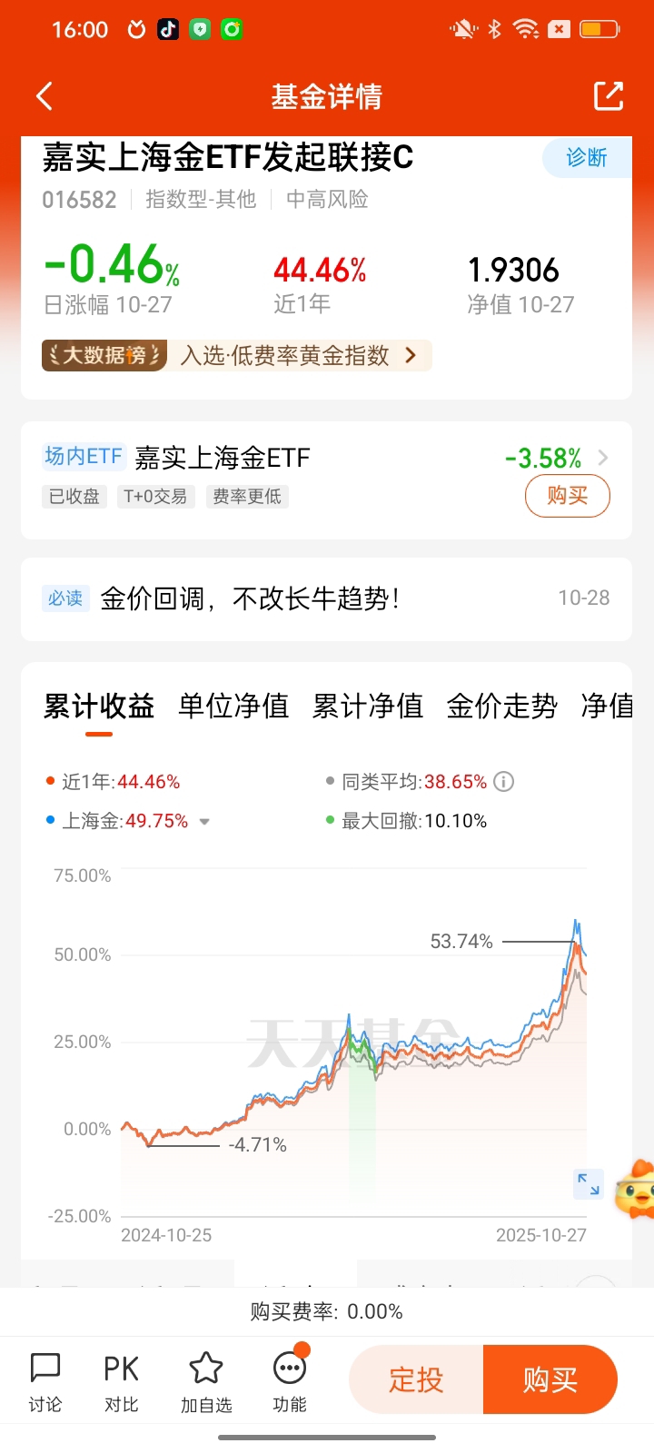 黄金近期回调频繁,让人心痛,不过短期下跌不影响黄金长期逻辑,回调反而提供加仓机会,今天我继续加仓500$嘉实上海金ETF发起联接C$ 这个产品,为什么选择这个,因为这个产品费率低而且七免操作起来很灵活,最重要的是在这次黄金市场大震荡中它跌的比较少,显示出它防守能力很不错,作为黄金板块坚定者,我相信黄金后续还能涨上来的。