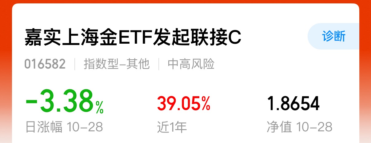 黄金大回调,要撤退吗?个人感觉问题不大,这次回调主要因为短期涨太多了,手里的$嘉实上海金ETF发起联接C$ 一年涨幅一度超50%,所以这一点回落也是正常。