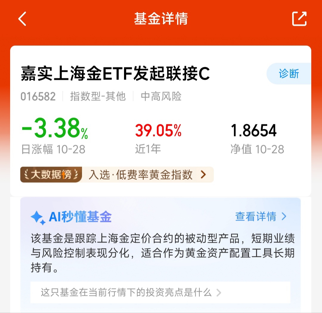 今天黄金反弹回暖了,经历了这一波回调,又有了上涨空间,随着市场对美联储降息预期的不断升温,黄金作为传统避险资产与抗通胀工具的配置价值,我继续看好,$嘉实上海金ETF发起联接C$ 这只基金它直接投资于上海黄金交易所的上海金合约,是紧密跟踪人民币计价黄金价格的硬通货。作为一只联接基金,它大幅降低了门槛,且持有满7天即可免赎回费,交易灵活,目前黄金反弹了,我继续加
