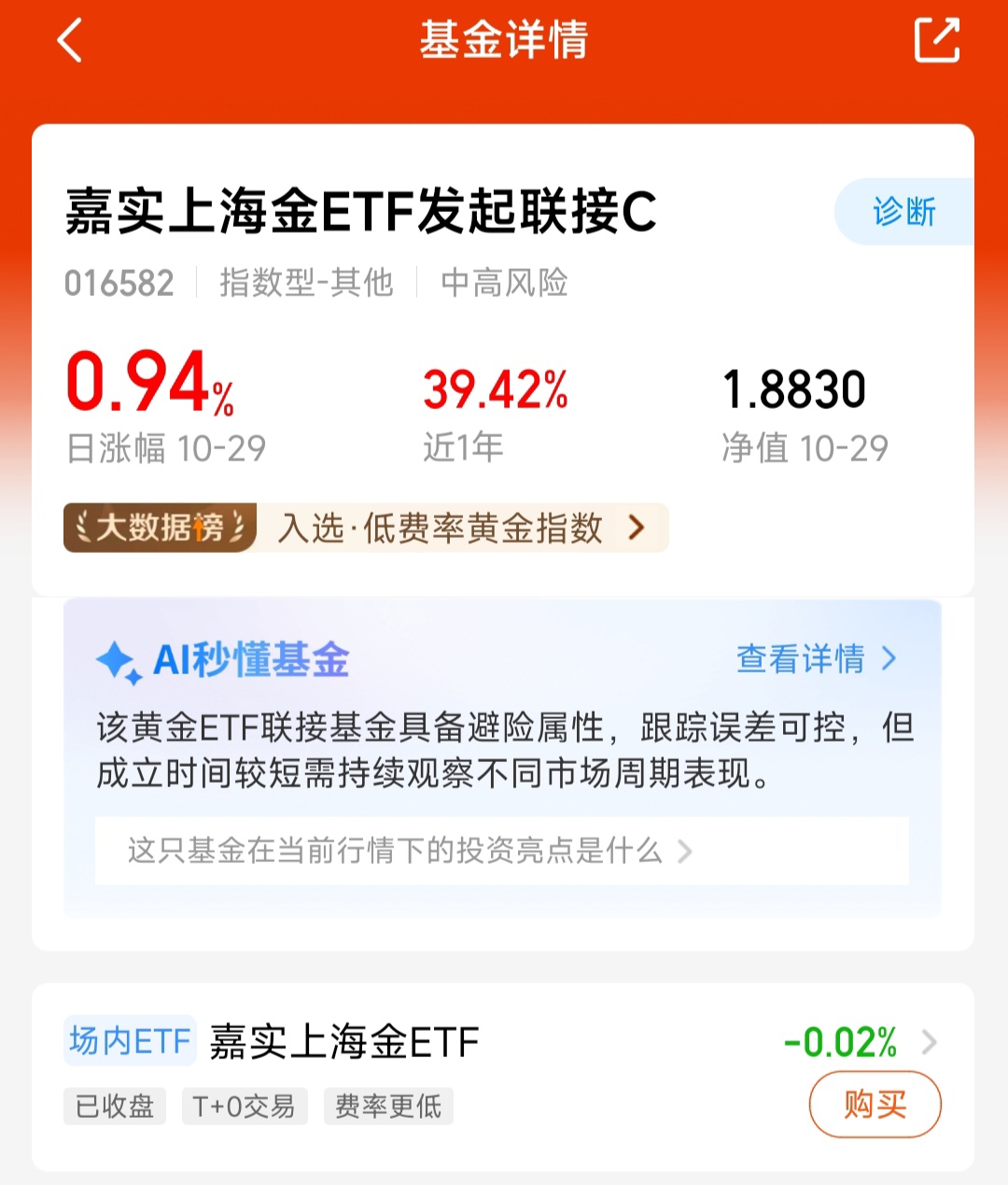 昨日黄金小幅反弹后,今日再度回调。数据显示,$嘉实上海金ETF发起联接C$近期表