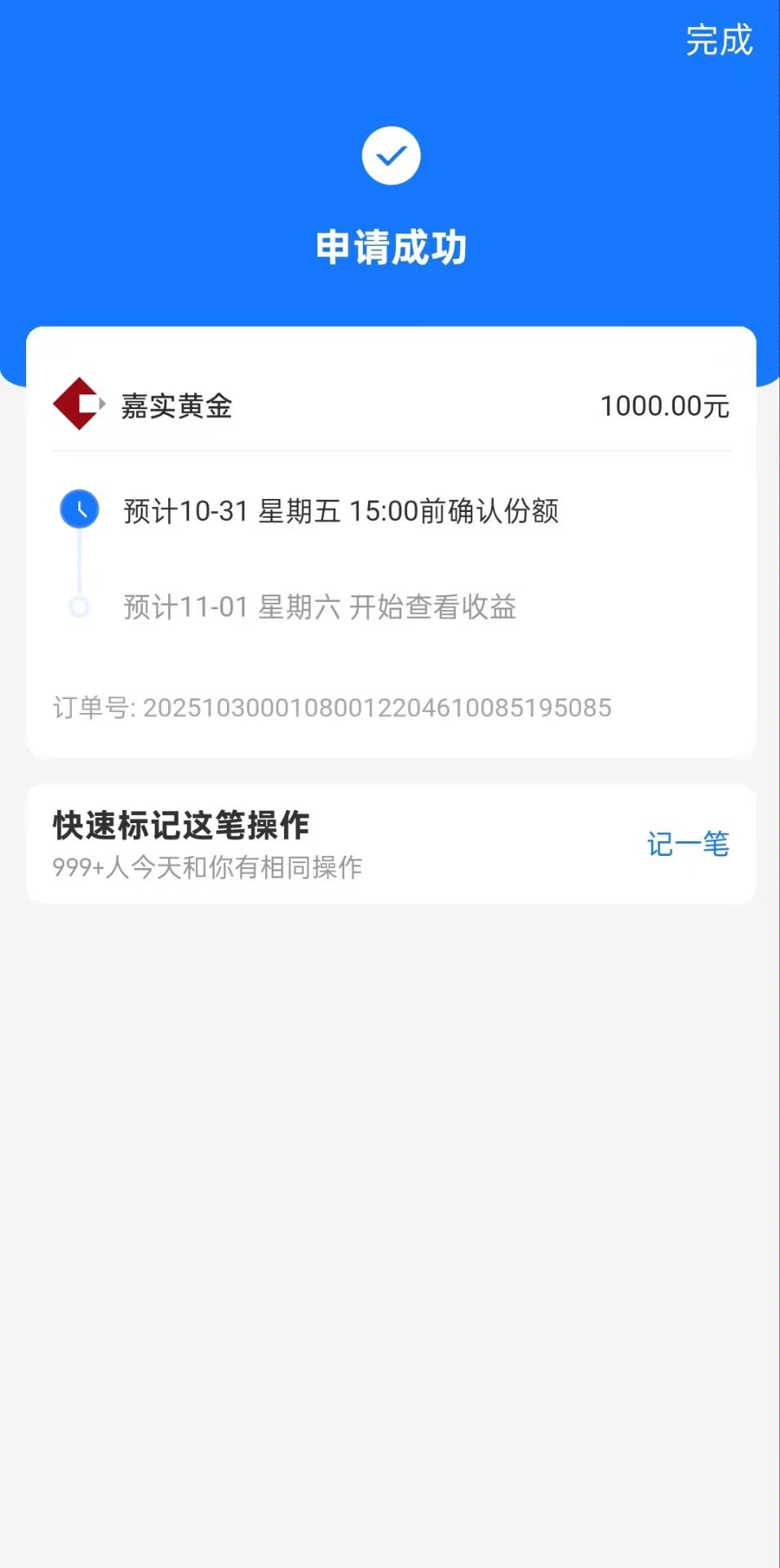 目前看来黄金在经历长时间的震荡下跌以后逐渐开始出现企稳的迹象了。我今天继续加1000$嘉实上海金ETF发起联接C$ ,这个产品表现不错的,昨日涨幅0.94%近一个月涨幅4.8%近三个月涨幅16.74%可以,长期来看黄金仍有不错的发展前景,美联储降息、去美元化趋势等因素依旧影响黄金市场走向,不能被这段时间的下跌而吓到了,坚持保持相信。