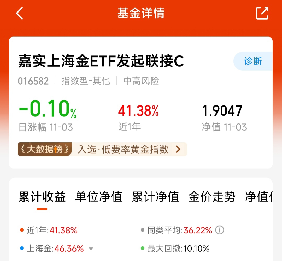 今日权益市场延续震荡走势,三大指数集体收跌。与此同时,黄金价格也持续回调,近期已出现不小跌幅。正是基于当前相对低位的布局机会,今日决定继续加仓$嘉实上海金ETF发起联接C$ 该基金表现相当亮眼,近三个月涨幅达18.2%,近一年收益率高达41.38%,业绩表现突出。值得一提的是,讨论区6楼正在开展回馈活动:持有100元可以领0.58元,持有1000元以上可领0.88元,蚊子再小也是肉,继续持有,静待后期表现。