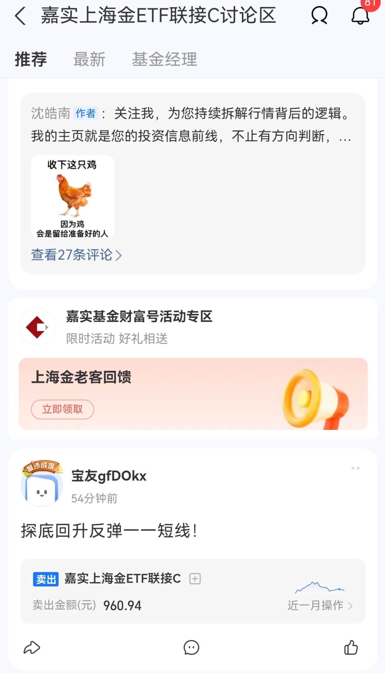 最近黄金反弹没破前高就回落,是不是很多人慌了?别急着啊,技术面瞅了眼:虽然涨势没之前猛,但调整幅度越来越小,小周期低点还在慢慢抬高 ,上升趋势的架子还没散!基本面更不用慌,避险需求以及市场预期摆在这儿,逻辑压根没断 我打算分批入$嘉实上海金ETF发起联接C$ $嘉实上海金ETF联接C$ ,反正拉长看都是低位布局。偷偷告诉大家,讨论区6楼还有福利,持有100块钱以上就能领到0.58元,1000块钱以上就能领到0.88元,真不错呢