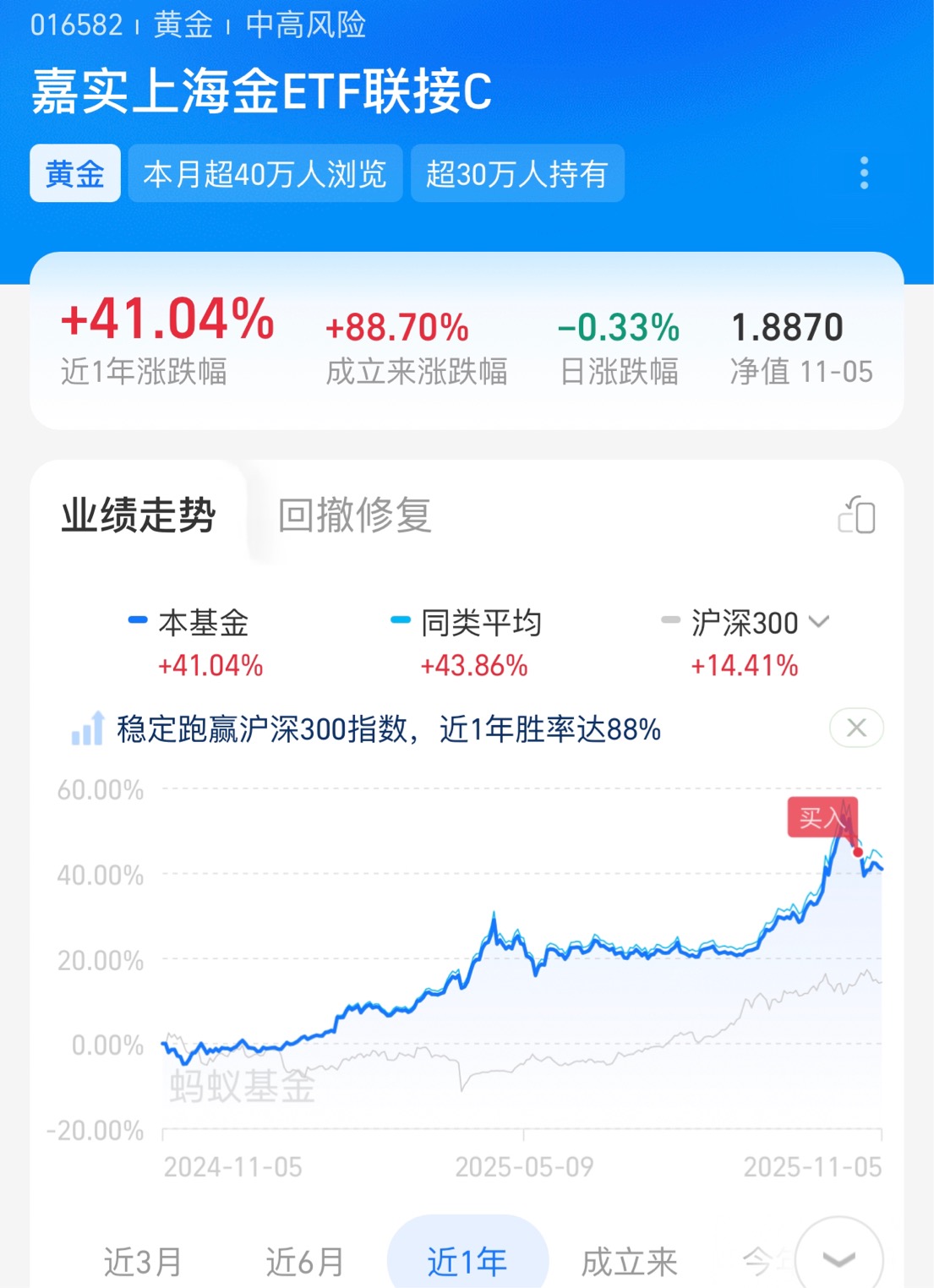 $嘉实上海金ETF发起联接C$ 紧密跟踪上海金定价,近一年涨幅 41.04%,持有 7 天免赎回费。还有可拿,持有上海金 100 元以上领 0.58 元红包,1000 元以上享 0.88 元红包,我先把领了等回踩进。