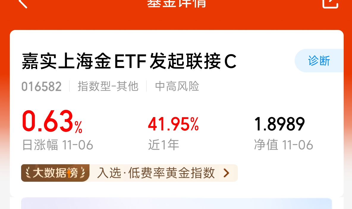 今天我小加这个$嘉实上海金ETF发起联接C$ 主要是现在美联储降息不确定,市场的主线不知道在哪里,黄金这个降息当然是有好处的,长期下来也比较增值呢,央行连续增持黄金的方向,已经高达11月了,我选择跟踪央妈买一些!近一年黄金也有涨40个点呢!