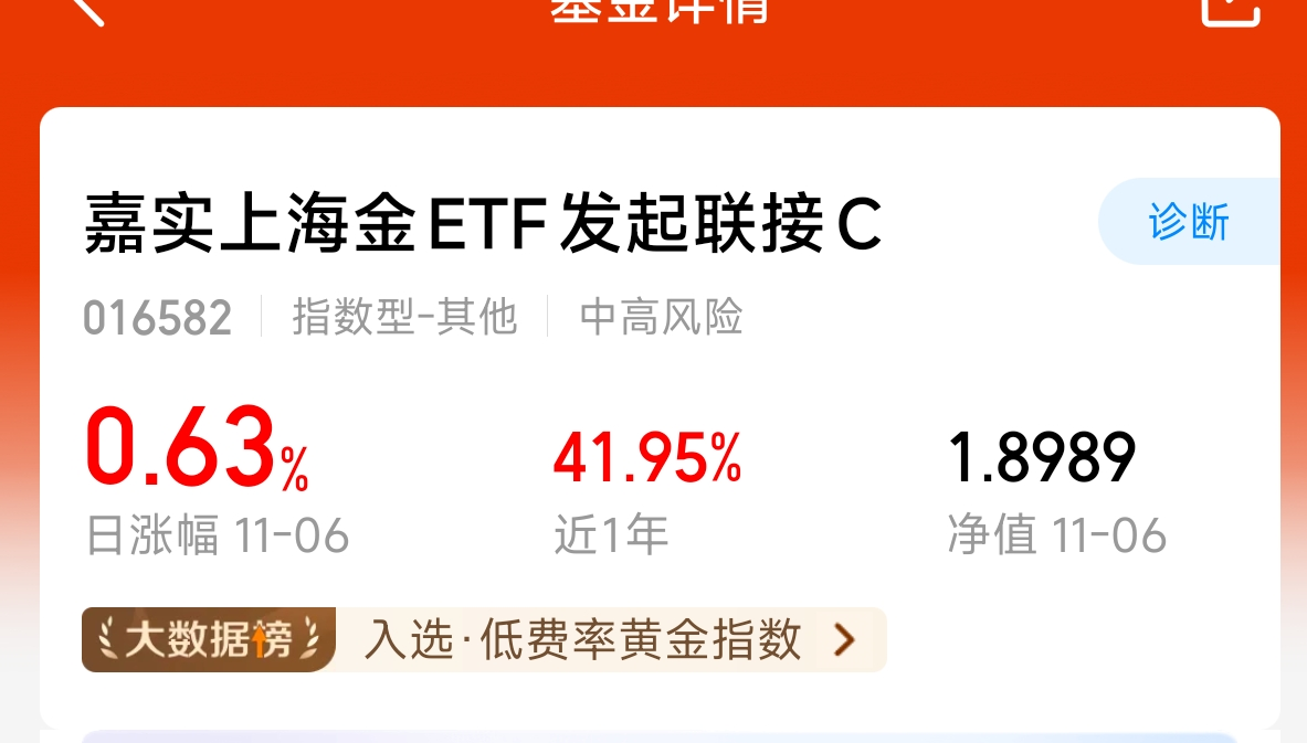 $嘉实上海金ETF发起联接C$ 今天布局黄金的方向,长期黄金还是上涨的,之前是一路上涨,涨得太高了,最高触及1000元,现在回落在900多价位了,现在各国都开始增持黄金,长期上涨依旧有空间,只是要拿的住,现在不断降息通货膨胀越来越高,黄金这一类的资产避险就越发升温。受人追捧。来此推动金价!这个还是7免的方便灵活!