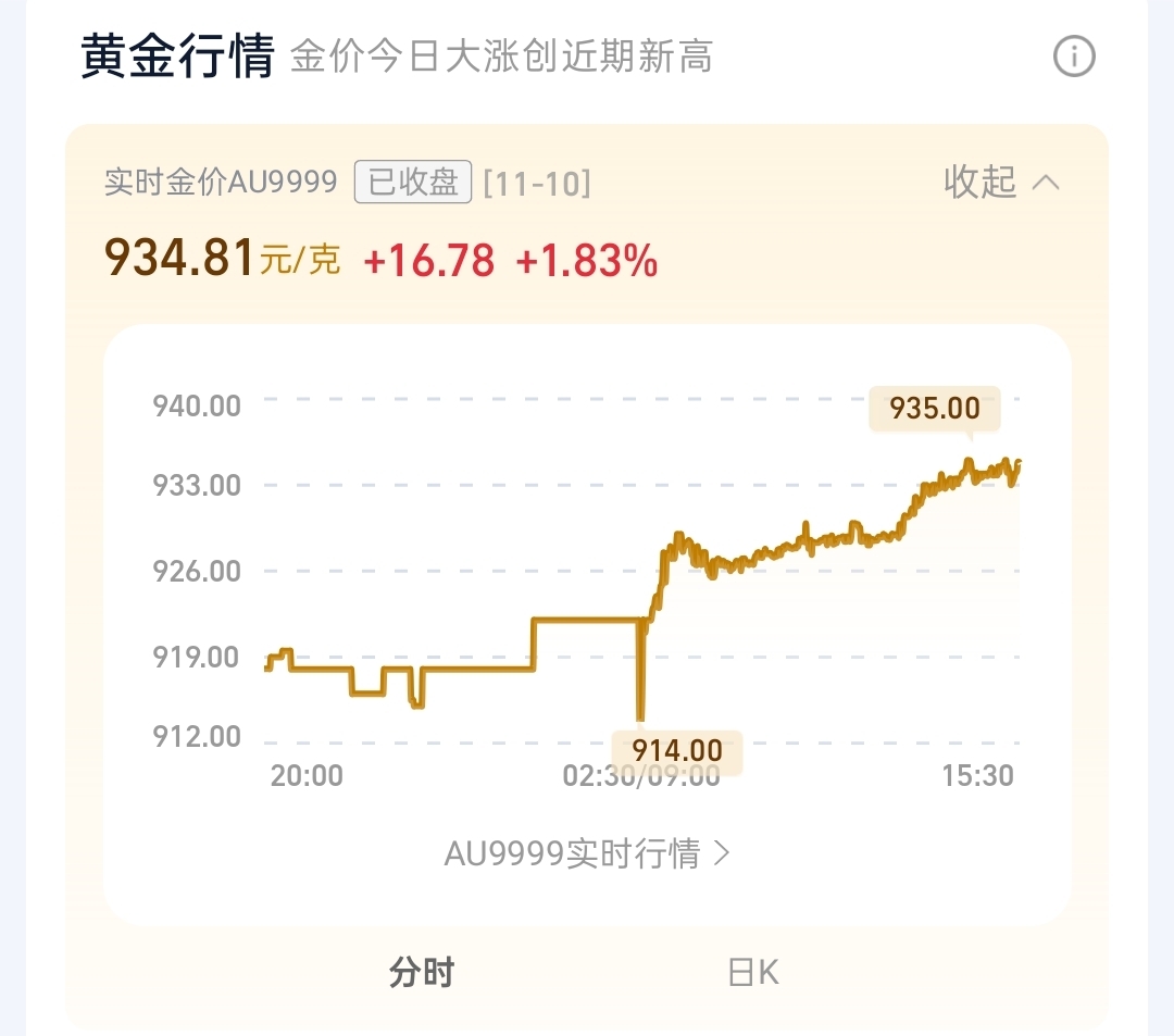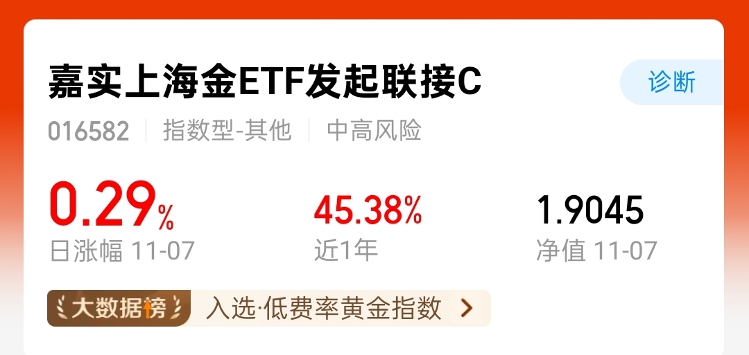 黄金市场渐渐企稳,这两天表现还不错,连着涨,特别是今天收盘涨幅1.83%创近期新高了。我一直都比较看好黄金,我关注的$嘉实上海金ETF发起联接C$ 感觉又要好起来了,这个产品七免,费率低这波黄金上涨可以舒舒服服吃波肉了,而且现在持有的还可以在讨论区薅红包福利美滋滋呀。