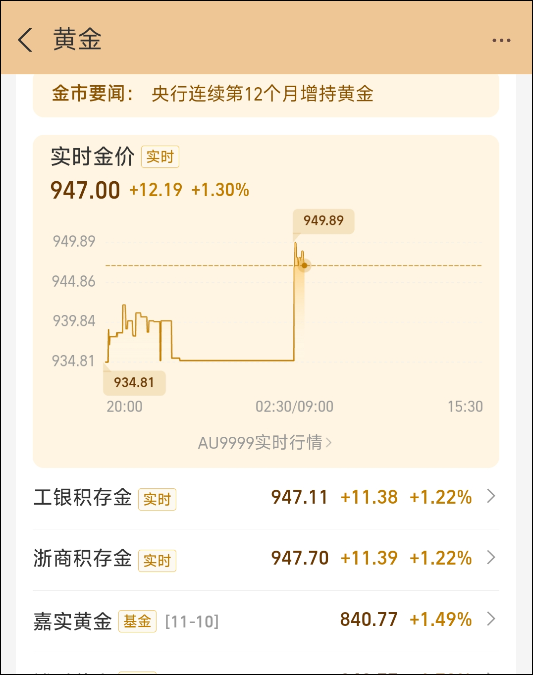 兄弟们,今天的黄金又是高歌猛进了,黄金的价位重启到950了,外围的消息政府停摆结束,后期的数据有希望进一步的公开市场,夜盘美股黄金全线收涨,$嘉实上海金ETF联接C$ 作为嘉实持有人,现在讨论区还可以薅菜包100-0.58%,1000-0.88,在6楼,我还是比较喜欢薅一些羊毛的呢,黄金长期看好还是乐观的!