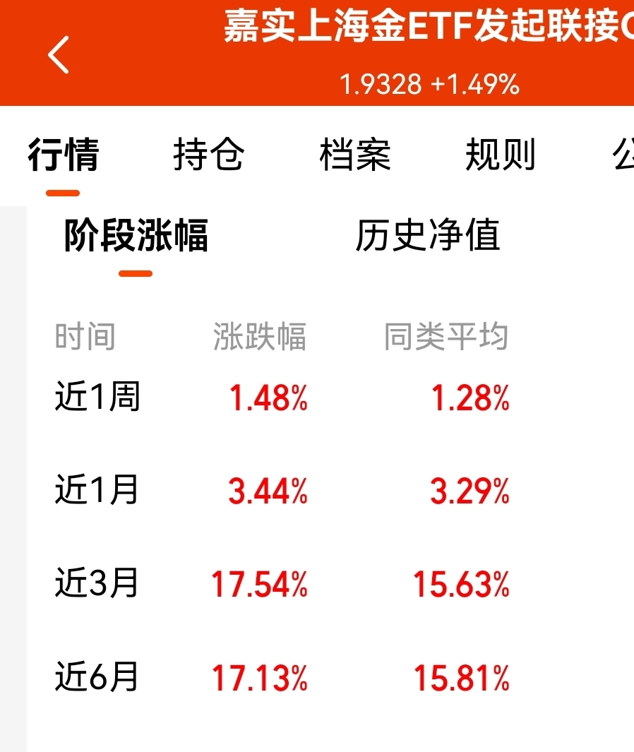 黄金走势又回来了,涨势不错,央行与海外机构亦同步增持黄金,全球配置热度持续升温,加上降息预期与长期配置需求共振,将继续支撑黄金市场活跃度,黄金需求依然很大,把握好这一波机会,$嘉实上海金ETF发起联接C$ 一直拿着的,业绩挺给力的,又4连涨了,近三个月涨幅17.54%,近一年涨幅46.55%,比同类涨得好。