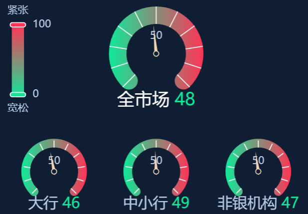 五、资金面情绪指数:全市场48 资金面维稳(0-100紧张度递增,50为均衡,超过50反映资金紧张)