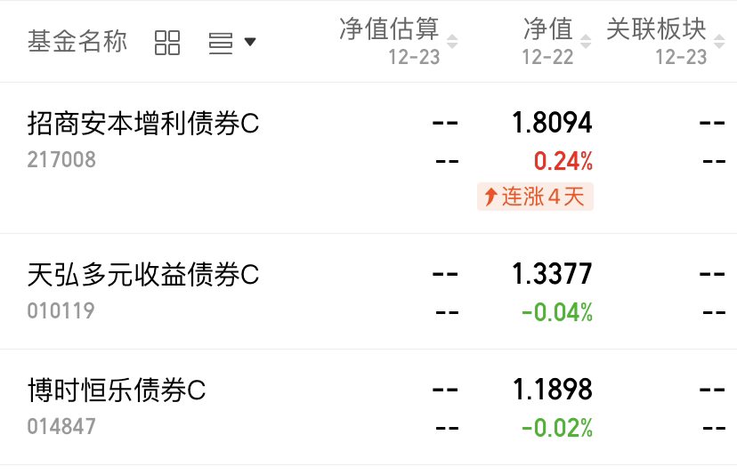 偏债基金大部分钱都用来买债券打底,只拿一小部分参与股市。这样一来涨跌都比较温和,不会像股票基金那样大起大落,持有起来特别安心。就算市场震荡调整,它的波动也相对小很多,$招商安本增利债券C(OTCFUND|217008)$昨日收了24个蛋。