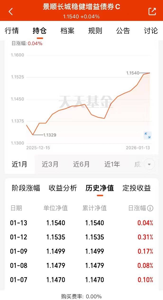 机构纷纷加仓固收 +,看重其 “压舱石” 作用。权益赚钱再多也得优化持仓比例,景顺长城稳健增益债券 C 近 1 年 7.28%,稳得没话说,7 连涨 + 0.04% 稳步攀升,固收 + 做底仓超合适,今天有望 8 连涨。