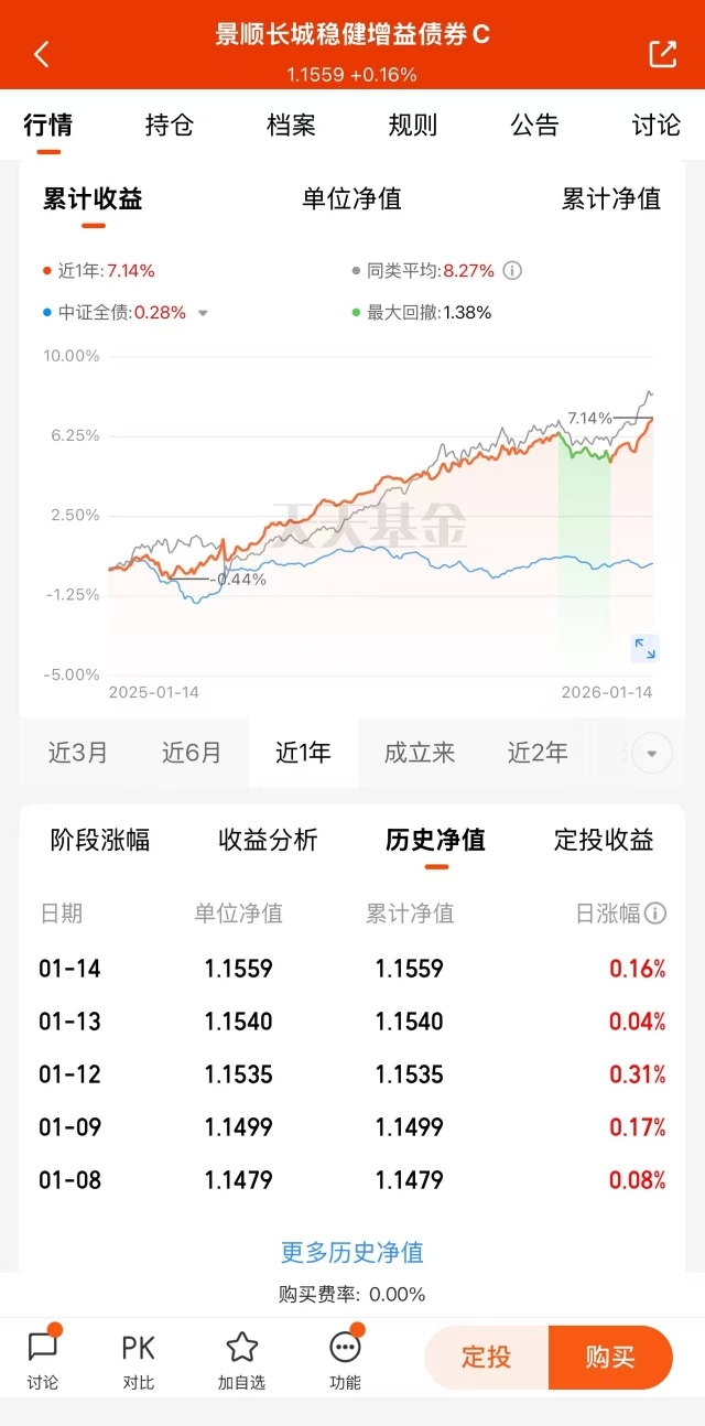 A 股市场个股涨少跌多,指数连阳但赚钱效应一般。景顺长城稳健增益债券 C 这只固收 + 太争气,9 连涨停不下来,近 1 年 7.14% 的收益很可观,今天估值红有望冲击 10 连阳,底舱配它能对冲不少波动。