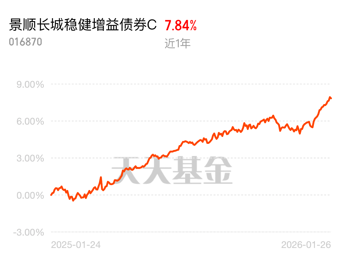 看这景顺长城稳健增益债券 C 的走势太安心,近 1 年 7.84% 稳步攀升一直向上,1 月就 2 天小跌,涨多跌少的表现太亮眼,既能拿债基的稳健收益,偶尔还能有股基的爆发惊喜,继续看好,蹲上车时机别错过$景顺长城稳健增益债券C$
