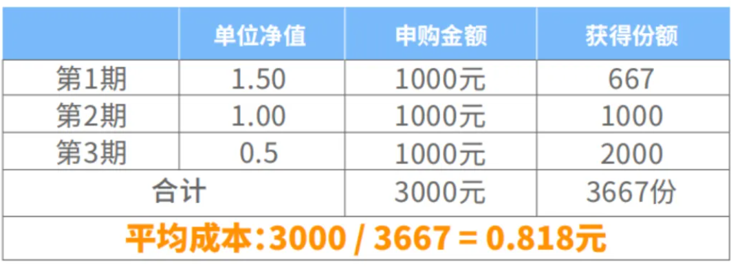 举个例子,当在一段调整行情中,连续三期(单位净值分别为1.5/1.0/0.5)投入1000元;通过定投,持仓平均成本为0.818元,当净值回升到0.818元时回本,涨回到1.00元赚22%。