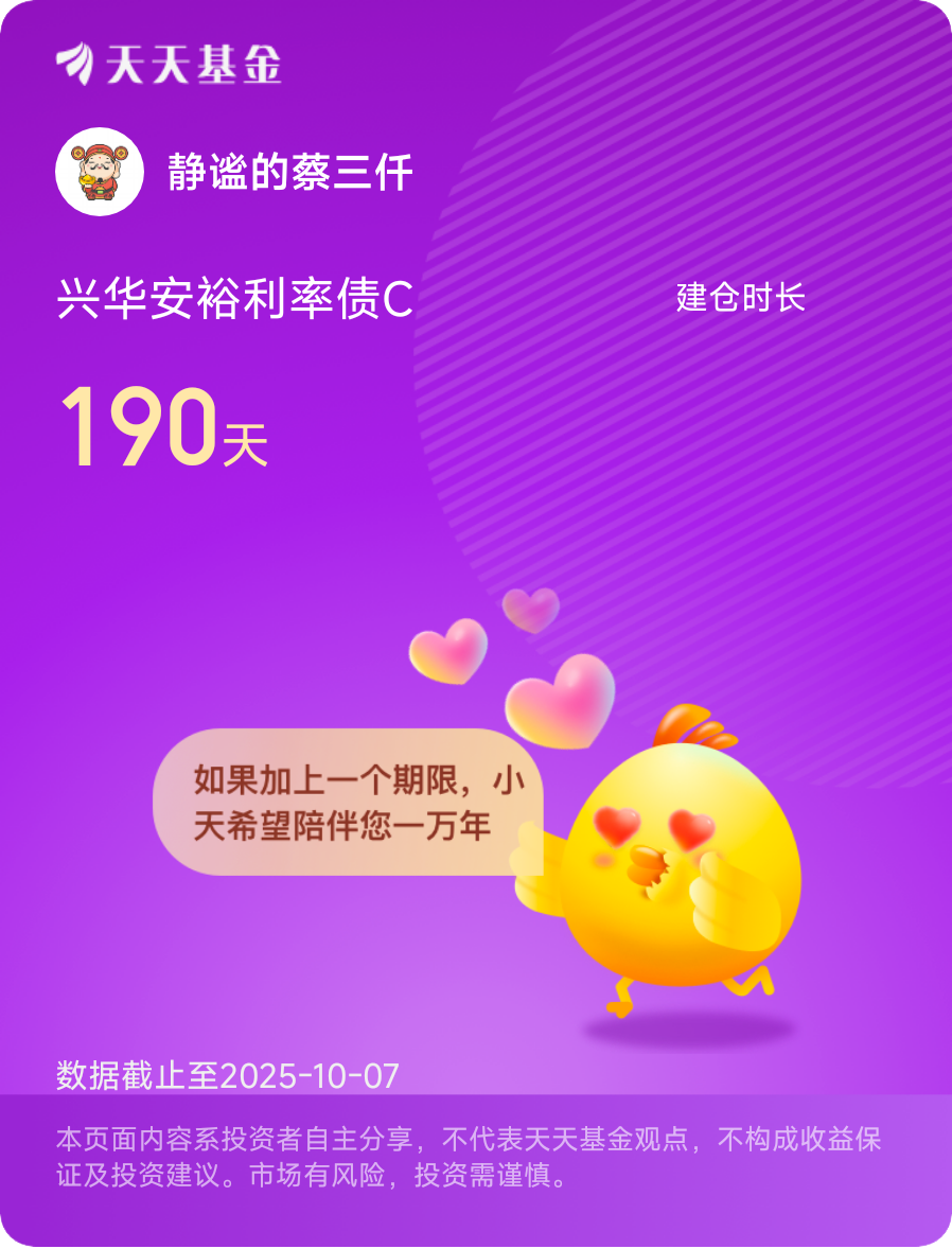 我是2024年知道$兴华安裕利率债C$ 的,当时对权益市场没有信心,所以决定移仓到债基。在随后的A股震荡行情中,很多投资者的心情跟随股市波动而变化着,一会晴一会阴,究其原因则是重仓了偏股型基金而导致账户一直阴晴不定,而我自己有一半的仓位都选择了债券基金,收益每天都是红红的,关键是还能跑赢余额宝。$兴华安裕利率债C$ 在我心目中就是高富帅,还一点都不渣的那种存在。在这个波澜起伏大浪滔天的投资市场,短债如同深夜里的灯塔让人安心。在过去两年来,债券一直被投资者视为稳健配置的优选,而相关债券类指数的走势,也让投资者体验了满满的收获感。但来到2025年,面临开年后债券市场的连续调整,不少像我这样的债基投资者会担心,近几年债券市场的上涨已经提前反映了市场对经济基本面和降息政策的乐观预期。而十年期国债收益率一降再降,在低利率环境下债券的票息收益空间越来越有限。所以我虽然对于2025年的债市依然较为值得看好,但我们作为投资者,对于纯债类基金产品的收益率预期,或许也应该“降降温”,重新理性看待。
