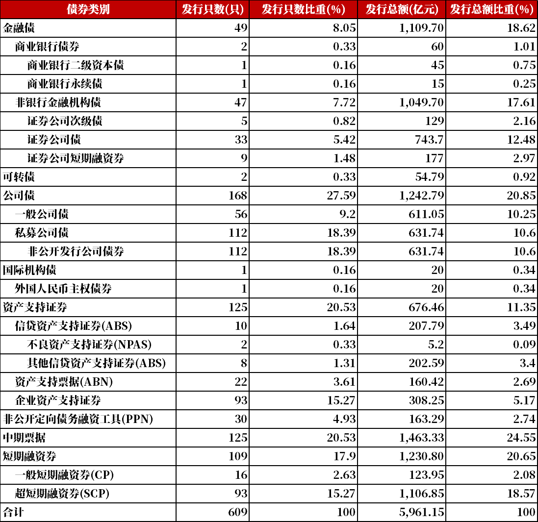 发行总览:债券市场一级发行信用债共609只,其中金融债49只,公司债168只,中期票据125只,短融109只,资产支持证券10只,非公开定向债务融资工具(PPN)30只,累计发行规模5961.15亿元。