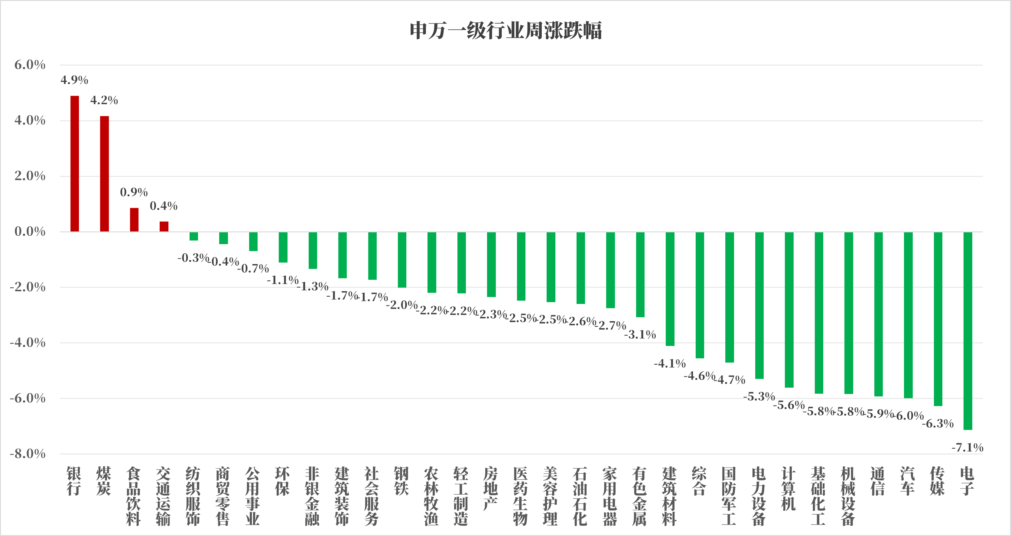 上周市场风格出现逆转,前期表现较差的银行、煤炭、食品饮料板块上周领涨,而前期涨幅较大的热门板块如电子、汽车、通信均出现一定程度调整。