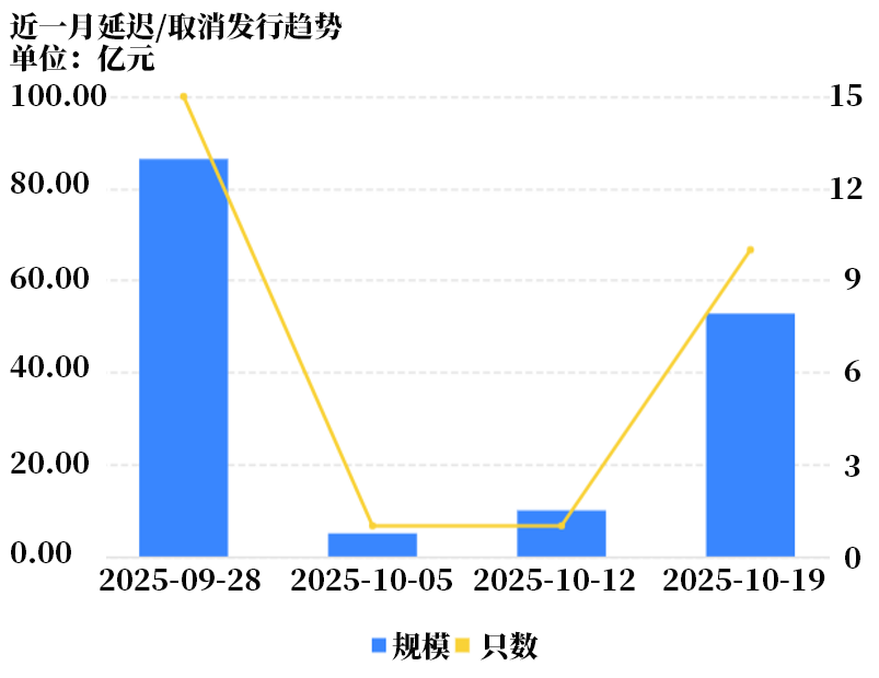 取消发行情况:取消发行的债券共10只,累计取消发行52亿元,环比有所上升。近一个月共有27只信用债取消发行或者延迟发行,累计取消发行154.20亿元,最新统计如下: