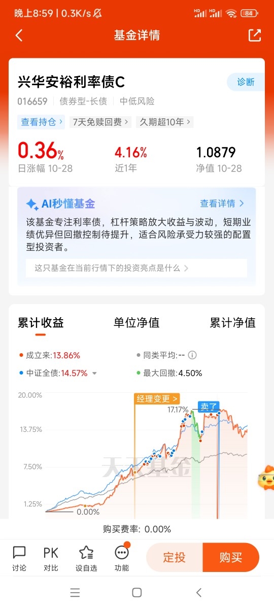 其三,费率结构亲民,长期持有成本优势显著。作为C类份额,兴华安裕利率债C的购买费率为0.00%,且持有7天以上即可免赎回费,极大降低了小额分批投入的成本门槛。从综合费率来看,其年化运作费率仅0.61% ,在同类利率债基金中处于较低水平。对定投投资者而言,低费率的复利效应会随持有时间不断放大,长期下来能为收益“省出不少空间”。