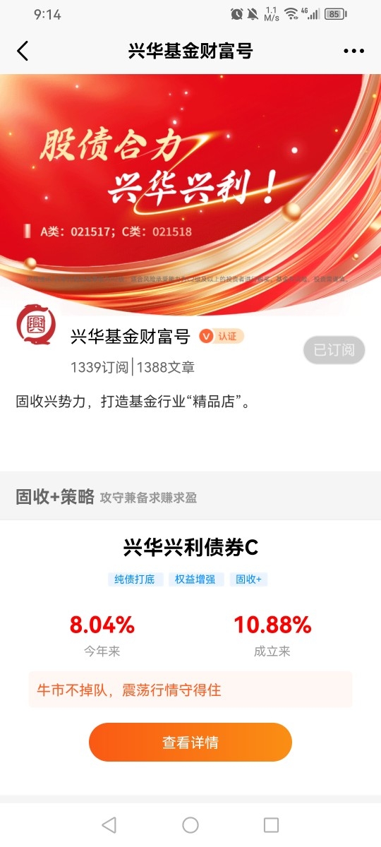 其实选基金就像找伙伴,既要靠谱,又要适合自己。兴华基金这几年一直在完善产品线,从稳健的中长债、“固收+”,到不同策略的产品,不管是像我这样偏好低风险的投资者,还是想追求更高收益的朋友,都能找到匹配的标的。而我自己的定投组合里,这两只纯债基金就是“压舱石”,有它们打底,再搭配其他产品,整个投资计划都更有底气。