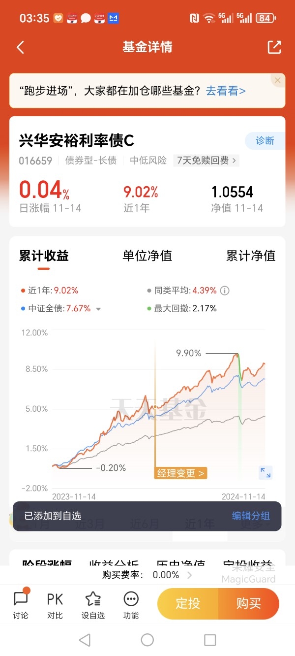 #日定投VS周定投,你更Pick哪一个?# 我选择周定投。作为一名普通上班族,投资理财对我而言从来不是追求暴利,而是让闲钱在安全的前提下获得稳定增值。在尝试过股票基金的波动后,我转向了债券基金,特别是兴华安裕利率债C,它成了我投资组合中不可或缺的基石。债券基金最吸引我的特点就是低风险、收益稳,主要投资于国债、政策性金融债等,这些债券到期还本付息,违约风险极低。我持有兴华安裕利率债C已经一年,最大单日波动仅0.03%,年化收益约5%,远高于银行定期存款的3%,而且波动小到几乎可以忽略,让我在投资时完全不用焦虑。我看好债市后市,是因为当前A股已积累较多涨幅,存在回调可能,这时候布局债券基金恰到好处。债券基金在市场波动时能提供稳定收益,尤其适合风险偏好低的投资者。兴华安裕利率债C投资于利率债,背后有国家或政策支持,波动小,是市场调整时的理想避险资产。我选择周定投,是因为它完全贴合我的生活节奏。我月薪8000元,扣除房租和生活费后,每月能结余1500元,我设置每周定投300元。周定投相比日定投,手续费低得多,一年下来手续费仅7.8元,而日定投要54.75元,相差近7倍。而且周定投一周只需关注一次,不用每天盯盘,特别适合我这种工作繁忙的上班族。兴华安裕利率债C的优点很多,作为C类基金,它免申购费,管理费+托管费仅0.35%/年,是同类产品中的"地板价"。流动性好,T+1赎回,急用钱时可以很快到账。收益稳健,年化4.8%左右,比余额宝高,比股票基金稳。最重要的是,它不需要我每天盯盘,特别适合普通投资者。通过周定投兴华安裕利率债C,我不仅获得了稳健收益,还养成了良好的投资习惯,让投资真正融入我的生活节奏,不用为了市场波动而焦虑,这种"岁月静好"的踏实感,正是我想要的投资体验。