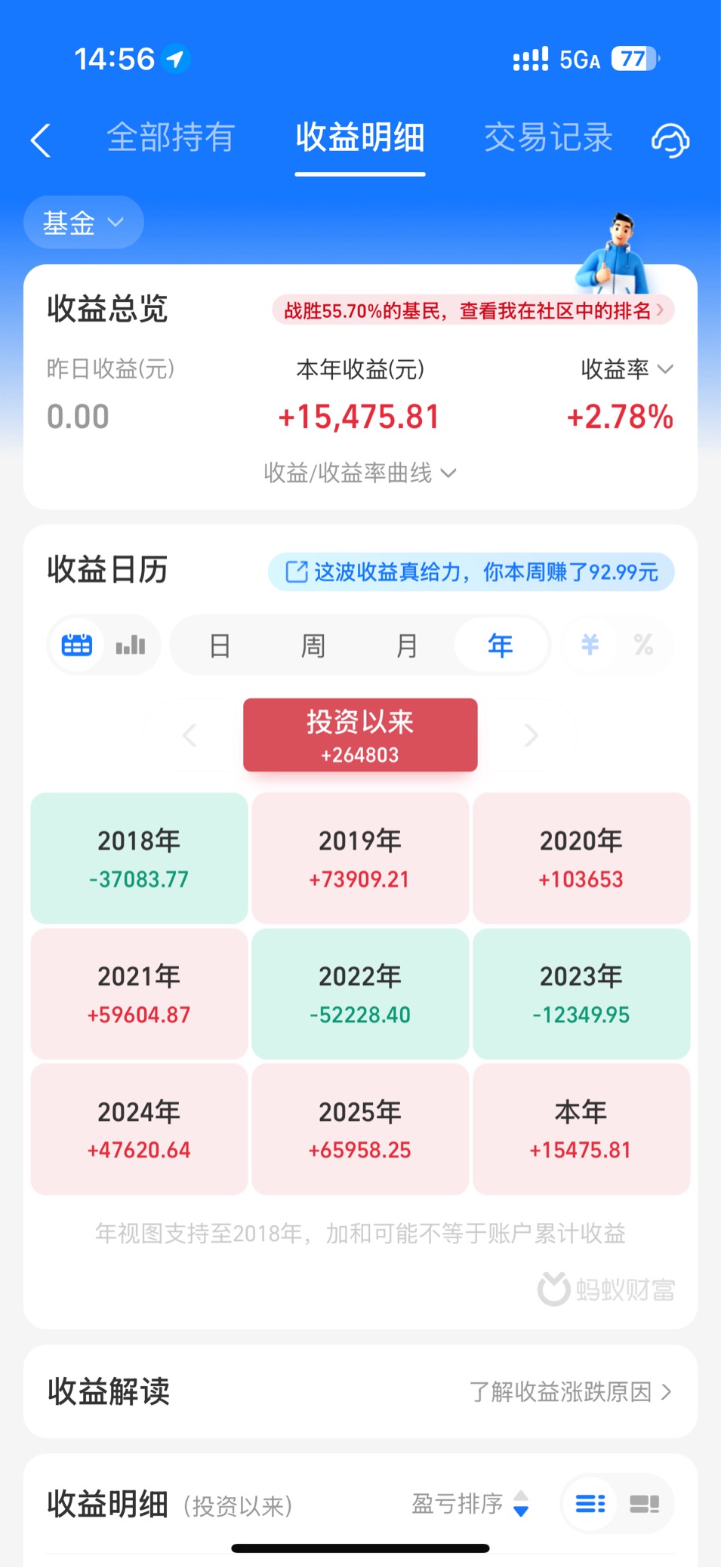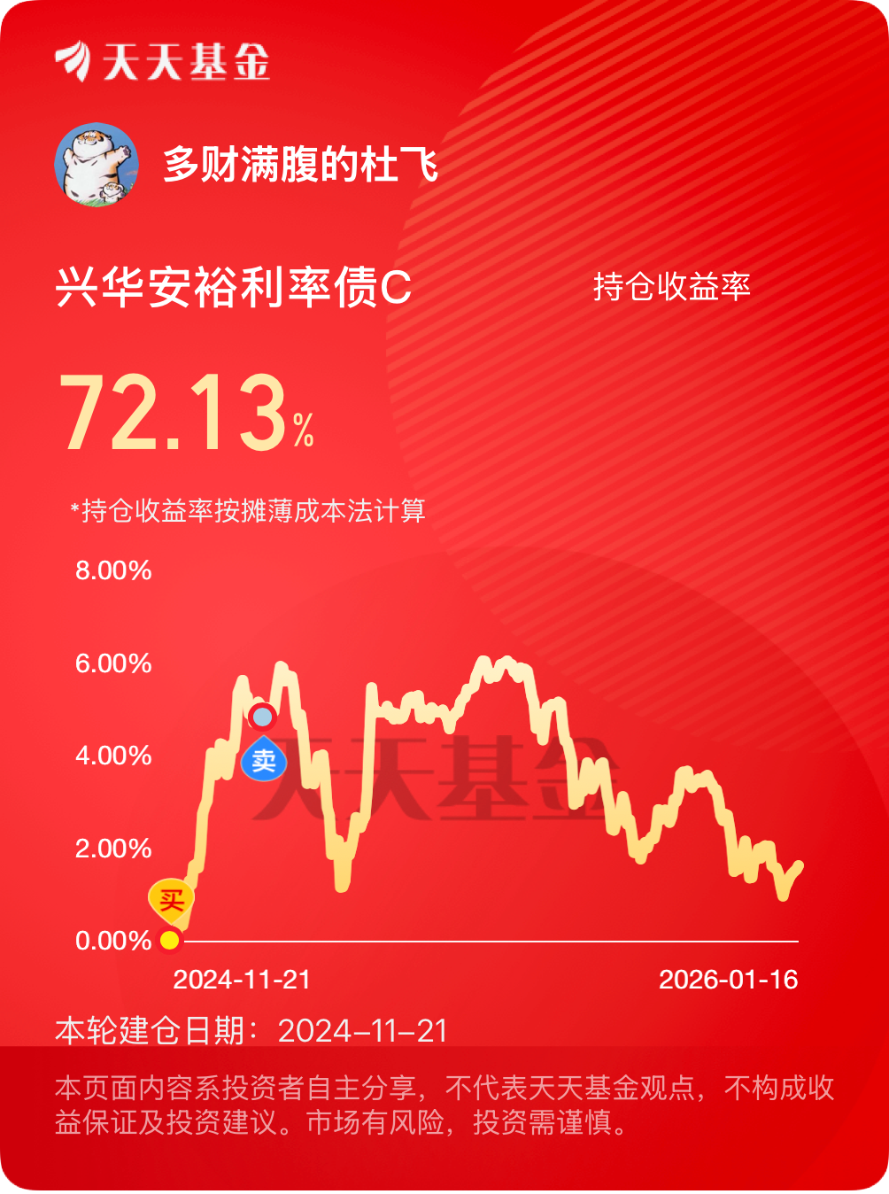 但投资就是这样,有得意的时候,就一定有失意的地方。第二部分操作,恰恰是我今年最大的败笔。我当时对债市过于乐观,觉得A股的行情可能不可持续,就把从权益资产里卖出的一部分资金,转头布局了太多的长债。我买的是兴华安裕利率债基金,这是一只中长债基金,还用了杠杆,最新的债券持仓比例一度高达133.45%。我当时的算盘打得很响,想着股市债市两头吃肉,稳当。可惜,市场的剧本永远不会按照你设想的来。这只基金在2024年表现其实很不错,A类份额净值增长了13.15%,但2025年我买入之后,它就陷入了持续的震荡下行。2025年全年涨幅为-2.64%,和之前的势头完全不能比。这笔投资不仅没能为今年的收益做出贡献,反而实实在在地拖累了整个组合的收益率,让我之前靠抄底赚来的利润折损了不少。现在想想,还是对自己判断力过度自信了,没有充分考虑到市场环境的变化。