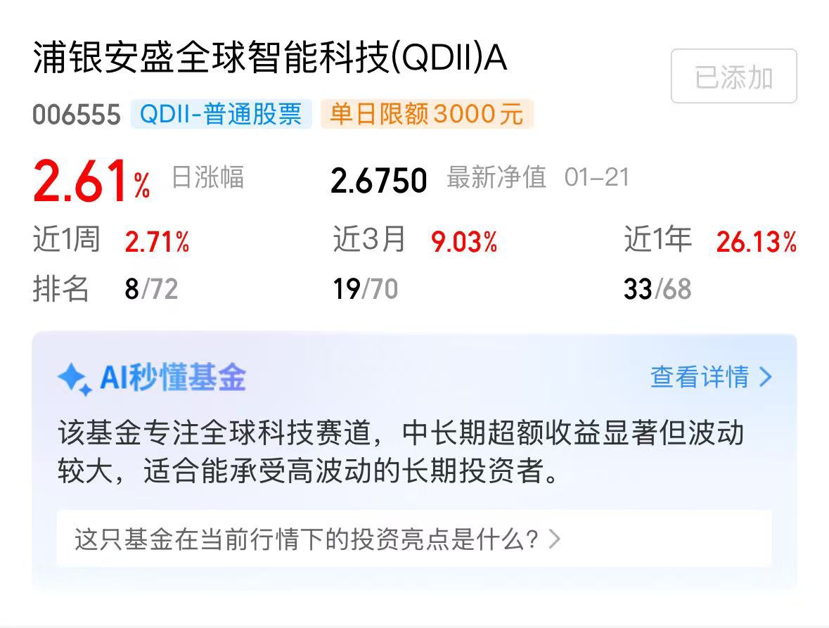 浦银安盛全球智能科技涨幅太牛了,2.61%完美吃定美股这波上涨红利$浦银安盛全球