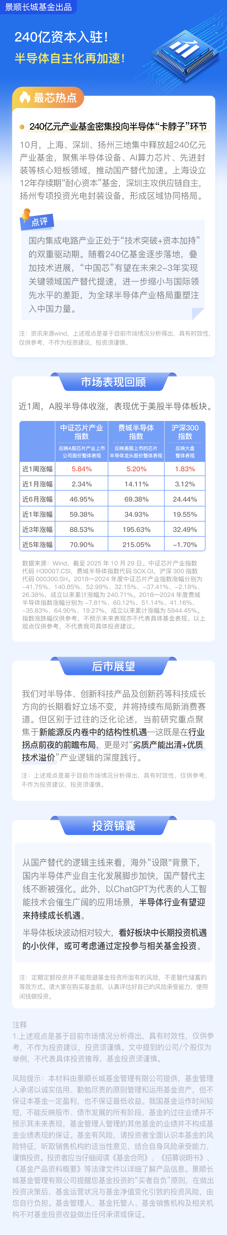 2025年10月,上海、深圳、扬州三地集中释放超240亿元产业基金,将资金精准导向AI算力、半导体装备等“卡脖子”领域,为国产替代按下“加速键”。半导体产业链后市怎么看?速看周报,查阅解析~