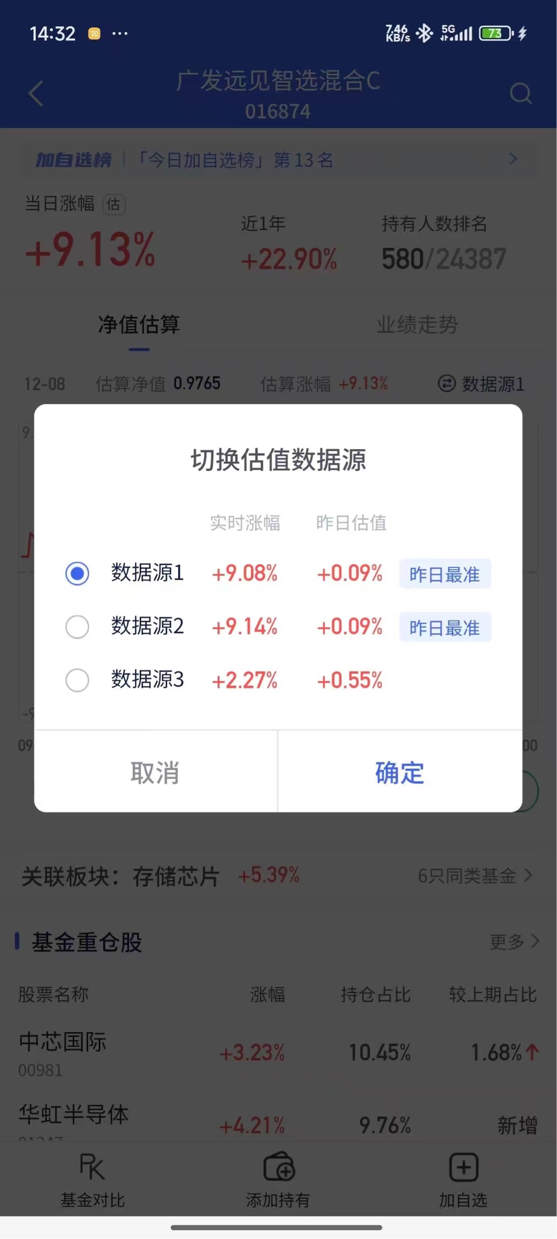 下午一看惊呆了!广发远见智选C单日冲高9个点,这弹性在存储芯片基金里简直一骑绝尘。别的存储基涨5%它敢涨9%,要跟存储风口,确实得选弹性足的,今天算是见识了