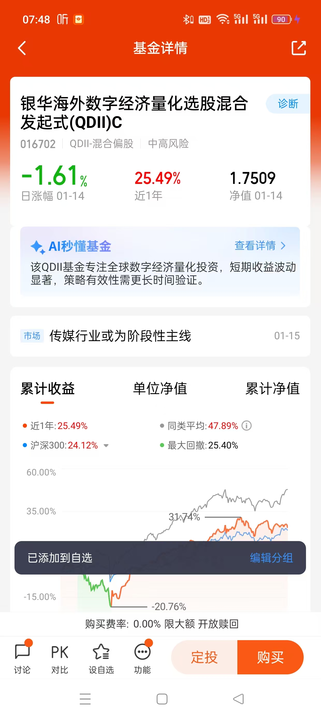 在众多产品里,我关注到了银华海外数字经济量化选股混合发起式(QDII)C(基金代码:016702)。它吸引我的点很明确:第一,它专注的就是海外数字经济这个赛道,特别是那些在AI、云计算、半导体等领域有核心竞争力的公司,这直接对准了我看好的方向;第二,它采用量化选股,能在全球市场里更系统、更纪律性地挖掘机会,避免基金经理个人的情绪干扰;第三,也就是非常实际的一点——它还能买得到。你可能听说过,很多跟踪美股的QDII基金因为太火爆,外汇额度紧张,把每日申购限额降到了很低,甚至只有一千元。相比之下,这只基金目前的额度条件对普通投资者要友好得多,这解决了一个大痛点。