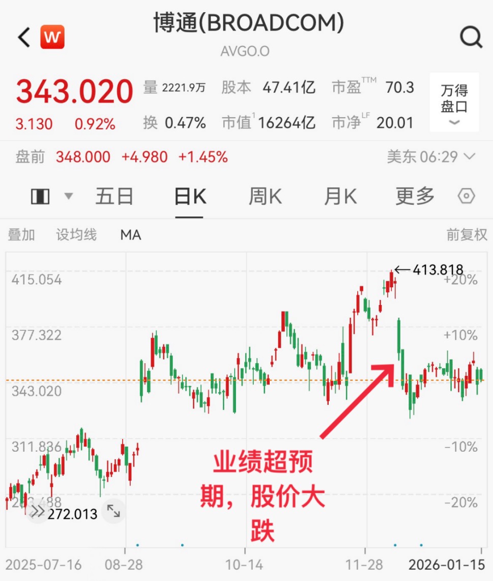第二,连卖“铲子”的AI基建股,自己也进入了审美疲劳期。最典型的例子是博通,去年12月发财报,营收和每股收益都超预期,结果就因管理层暗示下一季度毛利率可能环比下降,股价单日大跌超过11%。市场瞬间敏感起来:如果AI浪潮最后只是让营收增长,却赚不到真金白银的利润,那现在动辄70倍PE、20倍PB的估值,怎么可能撑得住?这个故事的第一章“基建狂潮”,市场已经听得有点累了。