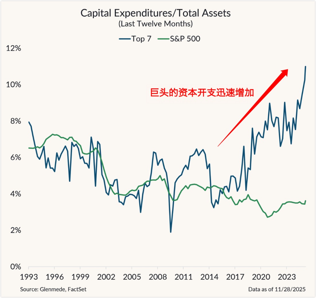 第一,是科技巨头们“烧钱”的速度,远远超过了赚钱的速度。2025年以来,以微软、亚马逊、谷歌、Meta为代表的“七姐妹”,在AI基础设施上的投入简直是军备竞赛。光是去年三季度,北美四大云厂商的资本开支合计就同比增长了67%。其中亚马逊最猛,预计2025年全年的资本开支要达到1250亿美元。钱像水一样流出去,可经营性现金流的增长却没跟上。当开支的增速持续碾压收益,市场就不再愿意为这种“为了不掉队而不得不烧”的游戏支付高额溢价了。估值撑不住,指数自然就涨得费劲。