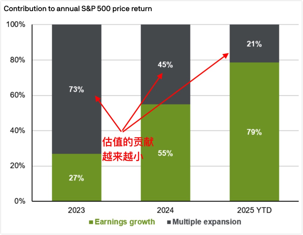 我的看法是,机会还有,但赚钱的难度明显变大了。过去三年,标普500的涨幅分别是24.23%、23.31%、16.39%,势头很好。但仔细拆解就会发现,估值扩张带来的贡献越来越小。涨了这么多年,美股的估值已经接近历史高位,再往上,天花板的感觉很强。2026年想继续涨,恐怕得靠实打实的业绩来驱动了。目前市场共识预期,标普500今年的盈利增长大概在13%-15%左右。所以,如果估值不变,收益率可能会低于过去三年;如果估值稍有回落,收益可能更平淡。