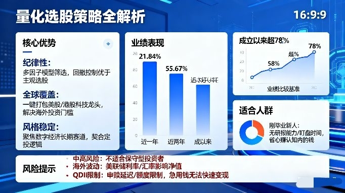 先聊最打动我的量化选股策略,这也是它区别于普通主动科技基的核心。很多人觉得量化就是“机器炒股”,但实操下来,它的优势太适合普通人:一是纪律性拉满,不被市场情绪带偏,不会追高题材股、割肉核心资产,严格按照多因子模型筛选成长、估值、盈利、动量指标,在科技板块大波动时,回撤控制明显优于主观选股产品;二是全球覆盖能力,一键打包美股、港股科技龙头,不用自己开海外账户、研究个股,解决了普通人投海外的门槛问题,完美分享AI、云计算、半导体的全球红利;三是风格稳定,不漂移、不炒短线,聚焦数字经济长期赛道,和我“长期持有、分享产业成长”的定投逻辑完全契合。