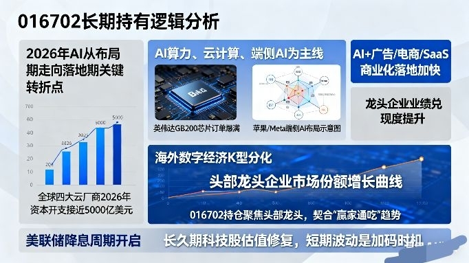研究基金不能只看历史收益,更要看懂赛道的未来,这也是我愿意长期持有016702的核心原因。2026年被多家机构定义为AI从布局期走向落地期的关键转折点,全球云厂商资本开支持续攀升,四大云厂商2026年资本开支有望接近5000亿美元,AI算力、云计算、端侧AI成为最确定的主线:英伟达GB200芯片订单爆满,算力硬件需求持续释放;苹果、Meta加速布局端侧AI,智能终端迎来革新;AI+广告、电商、SaaS的商业化落地加快,龙头企业业绩兑现度提升。