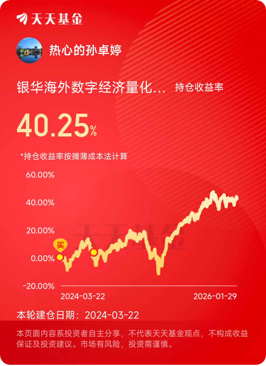 这只基金不是“闭眼入”的神基,它有波动、有风险、有海外市场的不确定性,但它是普通人布局全球数字经济、分享AI时代红利的优质工具。40%的收益不是运气,是定投策略、赛道选择、基金质地共同作用的结果,也是我从理财小白慢慢建立认知的见证。