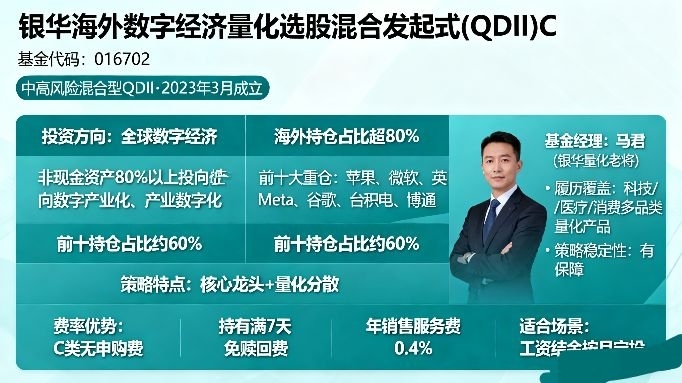 基金代码:016702,全称银华海外数字经济量化选股混合发起式(QDII)C,中高风险混合型QDII,2023年3月成立,基金经理是银华量化老将马君,深耕量化与海外投资多年,履历里覆盖科技、医疗、消费多品类量化产品,策略稳定性有保障。投资方向锚定全球数字经济,80%以上非现金资产投向数字产业化、产业数字化赛道,海外持仓占比超80%,前十大重仓是苹果、微软、英伟达、Meta、谷歌、台积电、博通等全球科技龙头,前十持仓占比约60%,既抓核心龙头又有量化分散,不会单票押注。费率对定投党超友好:C类无申购费,持有满7天免赎回费,年销售服务费0.4%,长期定投成本极低,适合我们按月用工资结余布局。