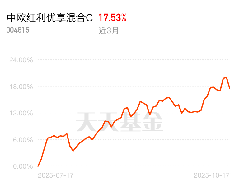 10 月看不少科技基金没以前猛了,反而红利板块挺出彩,毕竟市场外围不确定多,黄金还波动要调整,A 股也没主线。国家队都在买红利,中欧红利优享 C 能涨抗跌,蓝小康稀缺,红包划算,闲钱投点做底仓,每天再加仓!$中欧红利优享混合C$