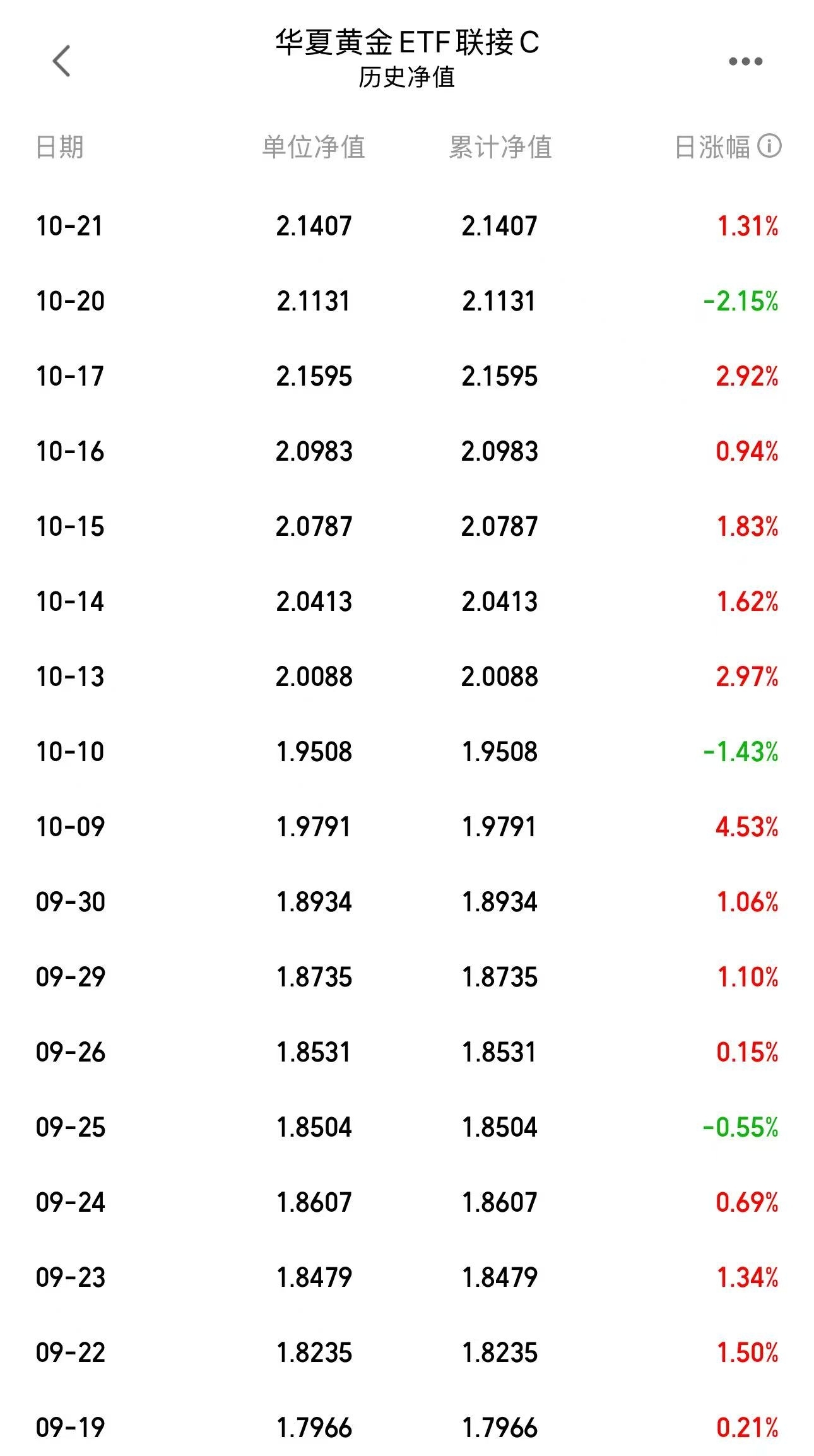 外围因素并未完全平静,这里近一年收益54.15%,昨天收益1.31%,$华夏黄金ETF联接C$最近走势都是涨得比较好,,今天倒车接人就继续加仓