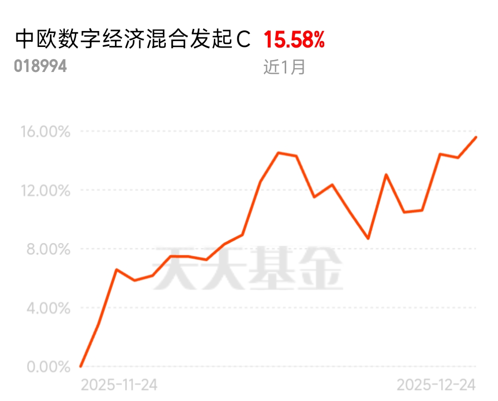 12 月 AI 算力板块涨幅领跑,多只龙头创历史新高,市场情绪高涨,中欧数字经济混合发起 C 近 1 月 15.58%,贴合 AI 主线不跟风追高。$中欧数字经济混合发起C$