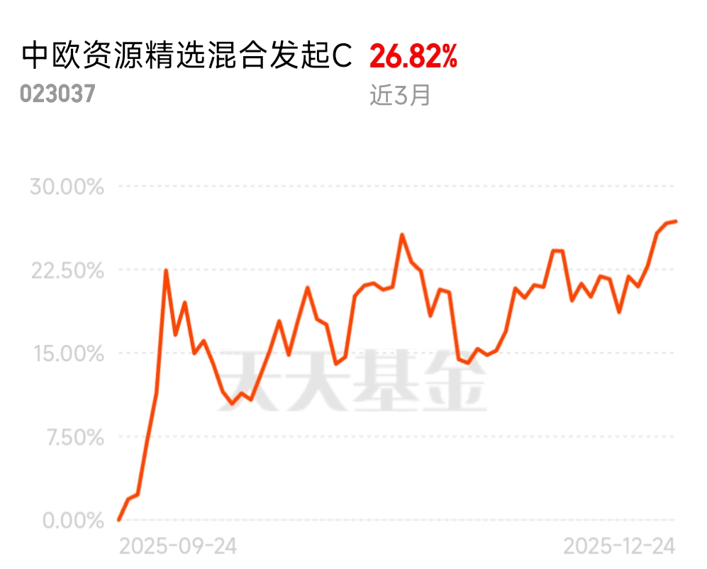 资源板块普调后估值回归合理,上车时机已到,中欧资源精选混合发起 C 近 3 月 26.82%,短期配置能抓反弹,长期靠绿色转型 + 供需缺口,在周期资源类中排名前列。