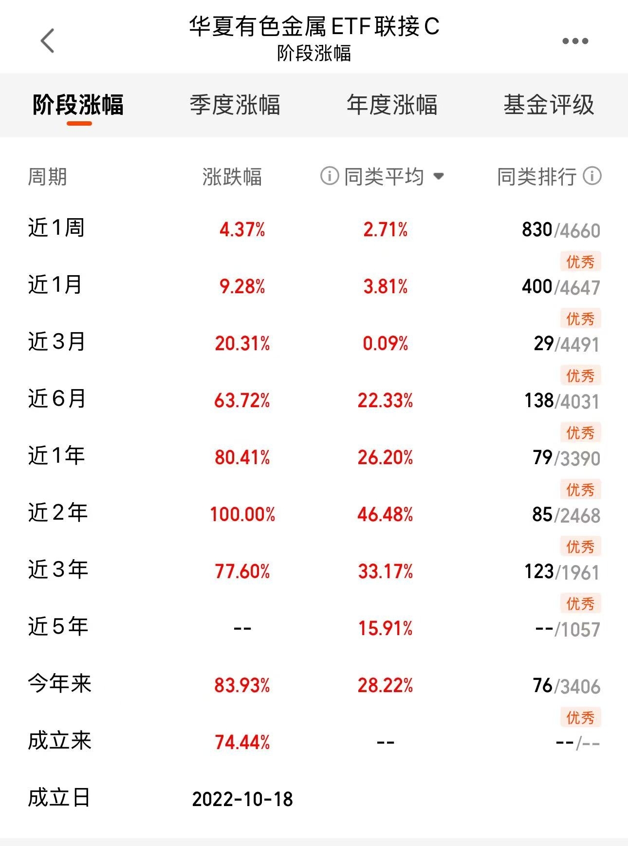 这基的成长性不错,集中布局有色金属产业链,行业属性超强,各阶段的业绩也都很不错,今天强势反弹,不错继续冲$华夏有色金属ETF联接C$
