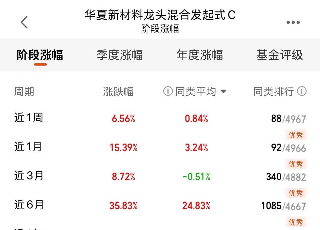 昨天收红算是逆势上涨,产品聚焦AI新材料(AI算力发展的硬件上游新材料,包含PCB材料、服务器液冷材料、光模块零部件材料),弹性大,单日涨幅能超5个点,近6个月收益也有35%+,成长股潜力足,可以低吸了$华夏新材料龙头混合发起式C$