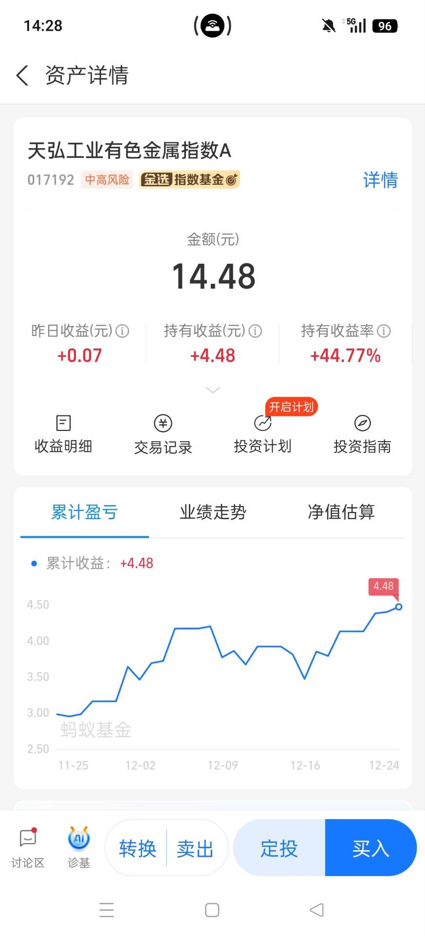 昨天贵金属跌得挺狠,但工业有色还算抗跌,我看了下天弘工业有色金属A/C,业绩表现