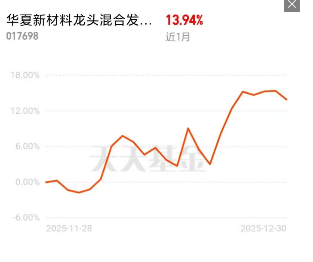 前面7天红5天,近一个月涨了快14%,$华夏新材料龙头混合发起式C$大趋势不错,长期业绩可期啊,聚焦AI新材料,弹性大,单日涨幅有时候能超5%,盈利确定性也比较强,趁低加仓冲啊!